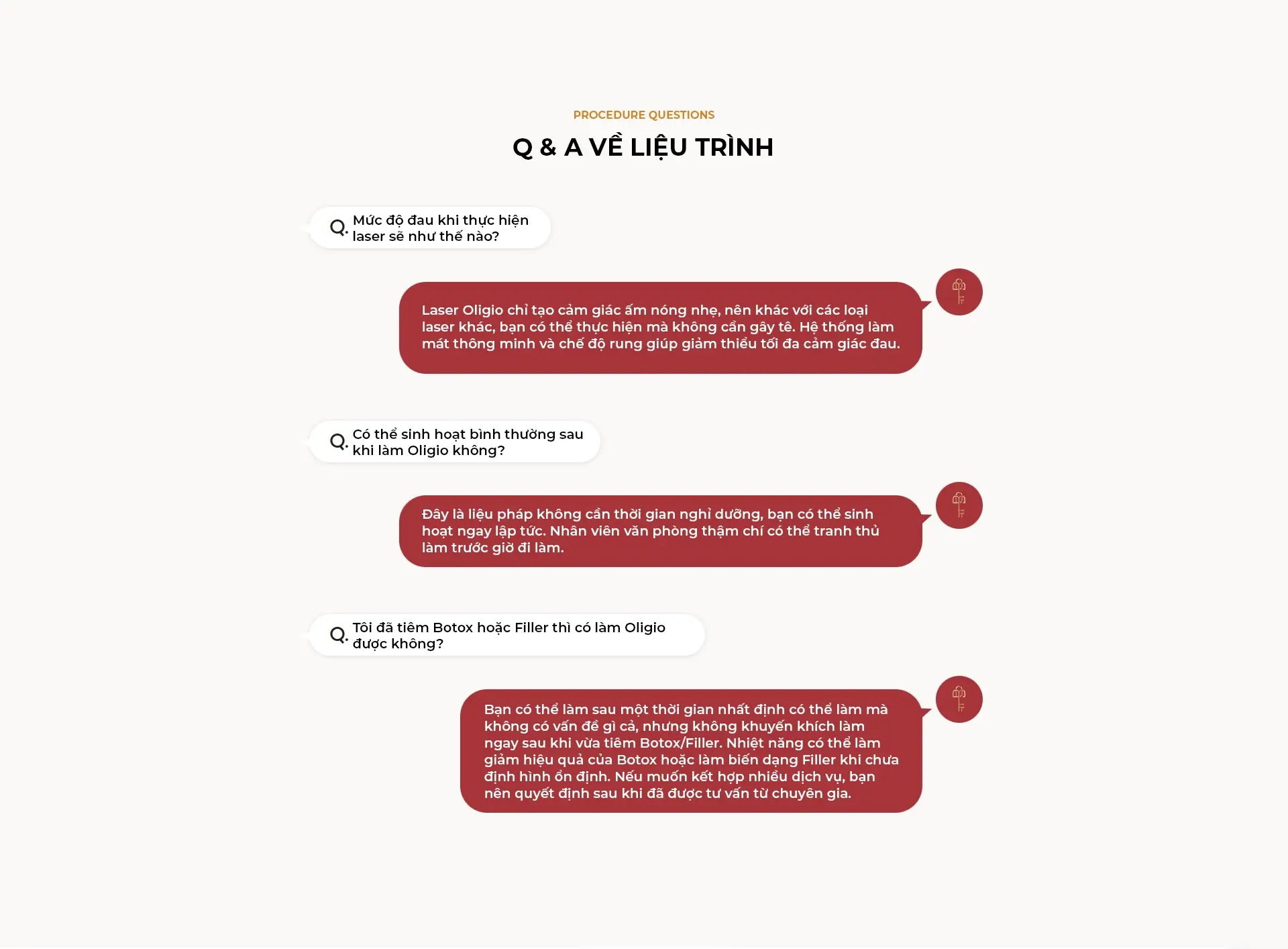 Oligio là liệu pháp sử dụng sóng cao tần RF để kích hoạt tăng sinh Collagen dưới lớp trung bì. Nhiệt năng sinh ra từ sóng cao tần đơn cực, kết hợp dòng điện an toàn, được truyền đến lớp trung bì gây biến tính collagen, từ đó cải thiện tình trạng da chảy xệ, nọng cằm và kết cấu da. Điểm đặc biệt là Collagen sẽ được sản sinh dần dần sau điều trị, giúp duy trì hiệu quả trong thời gian dài. Phương pháp không xâm lấn nên không cần gây tê, ít đau nhờ tích hợp chế độ làm mát và rung.